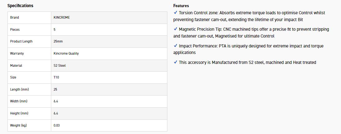 KINCROME K21369 IMPACT BIT TORX T10 25MM 5 PCK