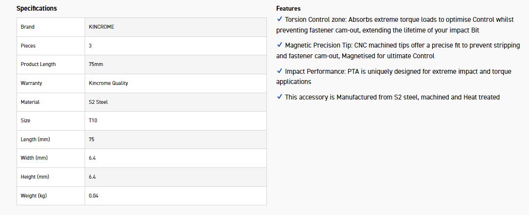 KINCROME K21374 IMPACT BIT TORX T10 75MM 3 PCK