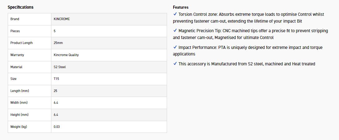 KINCROME K21378 IMPACT BIT TORX T15 25MM 5 PCK