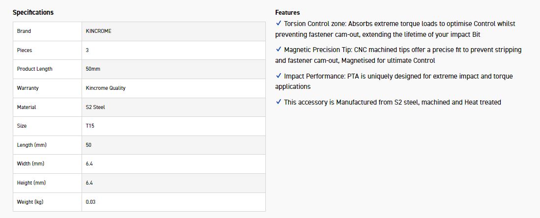 KINCROME K21379 IMPACT BIT TORX T15 50MM 3 PCK
