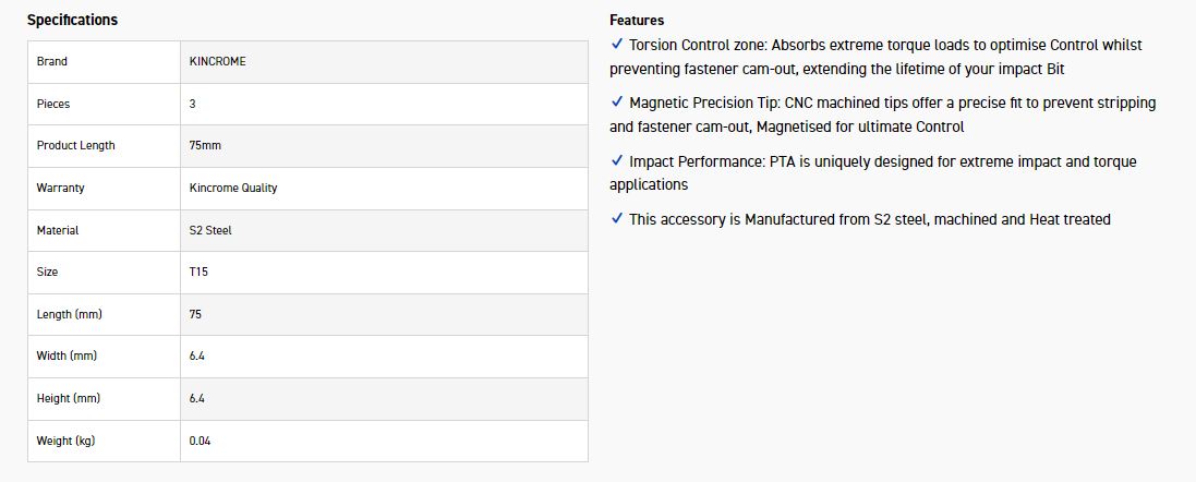 KINCROME K21383 IMPACT BIT TORX T15 75MM 3 PCK