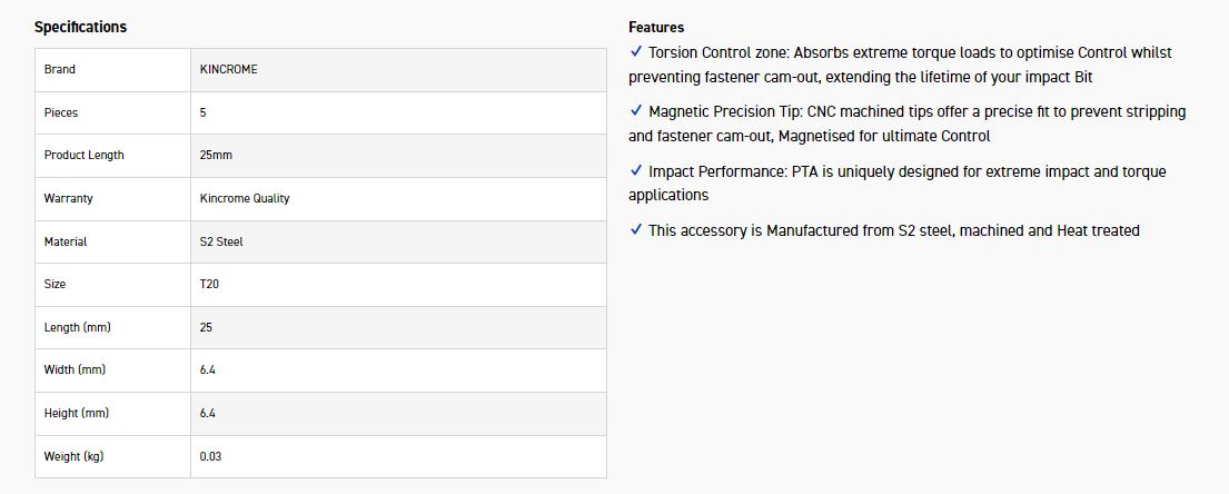 KINCROME K21387 IMPACT BIT TORX T20 25MM 5 PCK