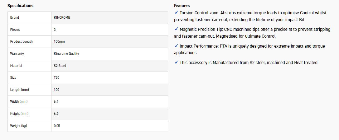 KINCROME K21398 IMPACT BIT TORX T20 100MM 3PCK