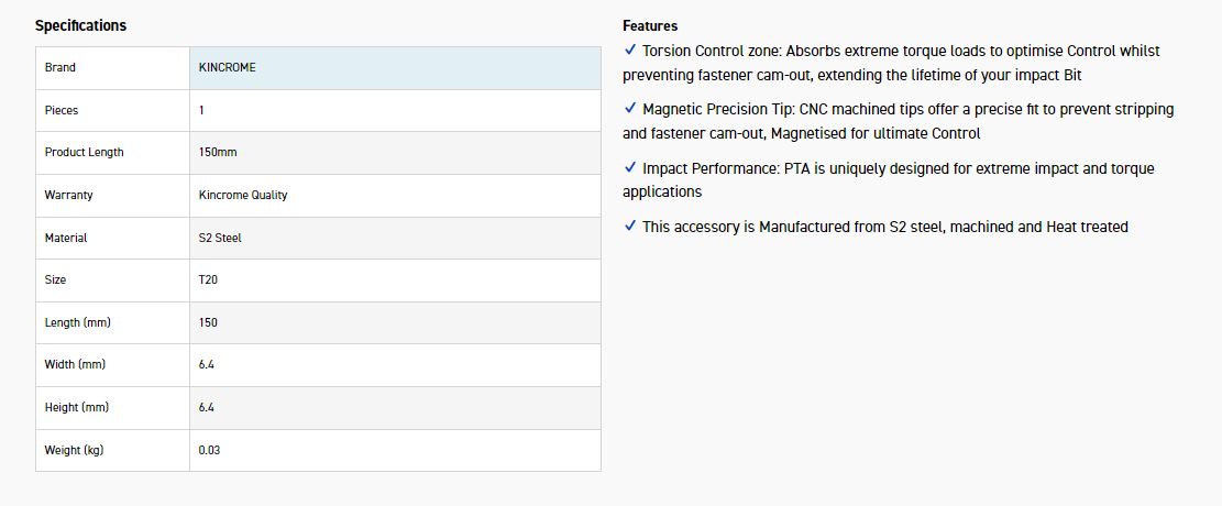 KINCROME K21399 IMPACT BIT TORX T20 150MM 1PCK