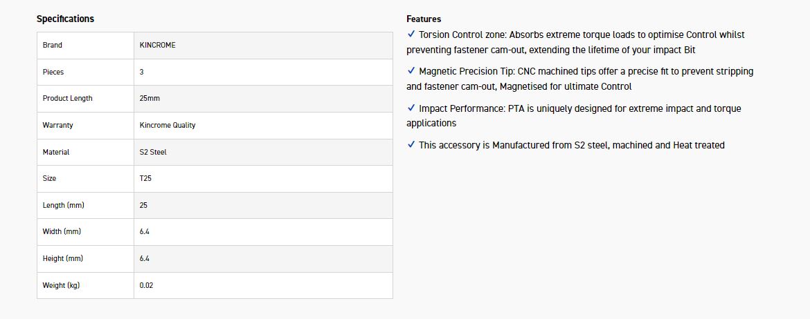 KINCROME K21401 IMPACT BIT TORX T25 25MM 3 PCK