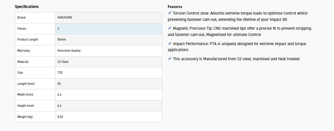 KINCROME K21405 IMPACT BIT TORX T25 50MM 3 PCK