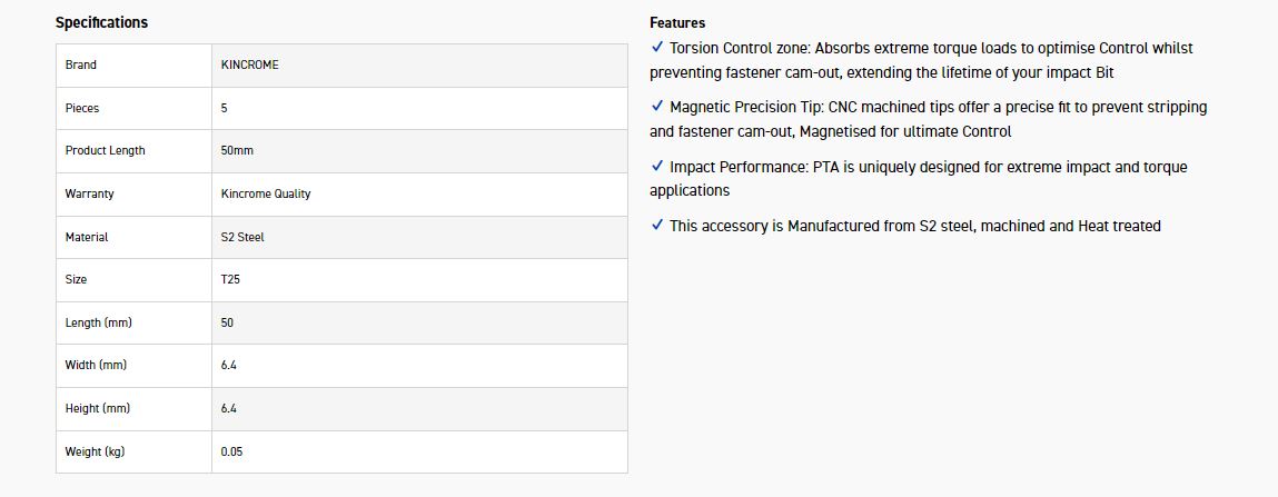KINCROME K21406 IMPACT BIT TORX T25 50MM 5 PCK