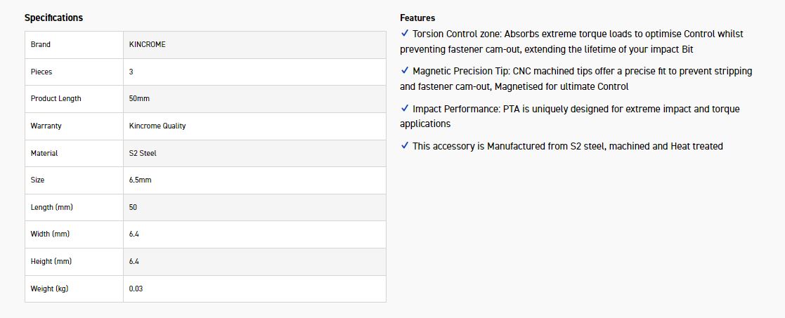 KINCROME K21457 IMPACT BIT BL 6.5MM 50MM 3 PCK