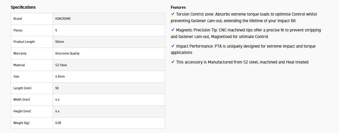 KINCROME K21458 IMPACT BIT BL 6.5MM 50MM 5 PCK