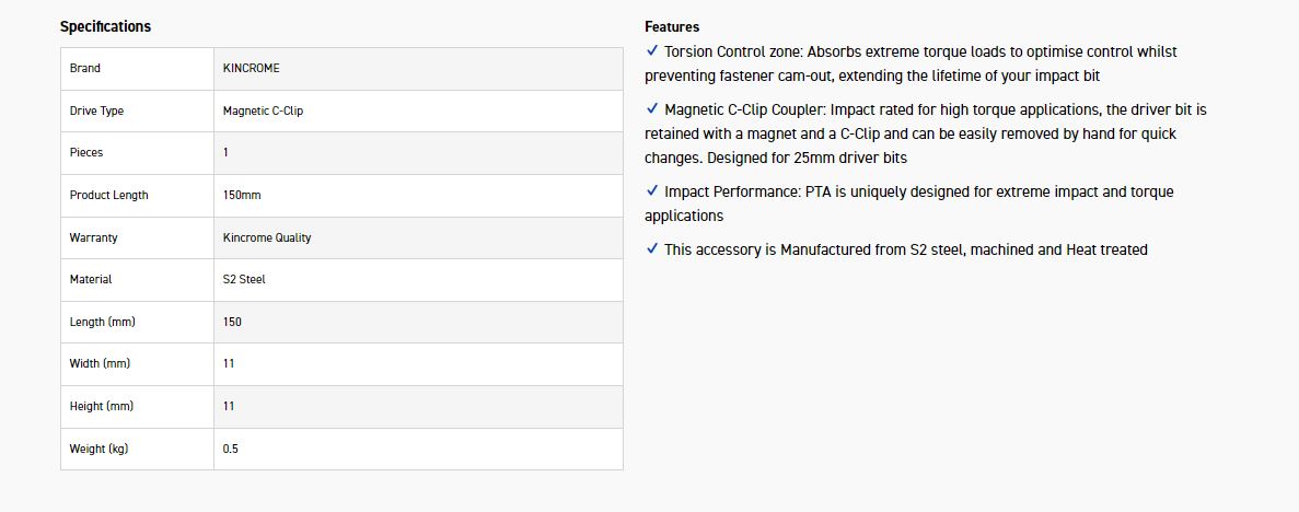 Magnetic C-Clip Coupler: Impact rated for high torque applications, the driver bit is retained with a magnet and a C-Clip and can be easily removed by hand for quick changes. Designed for 25mm driver bits