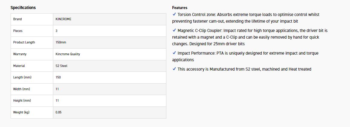Magnetic C-Clip Coupler: Impact rated for high torque applications, the driver bit is retained with a magnet and a C-Clip and can be easily removed by hand for quick changes. Designed for 25mm driver bits