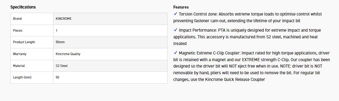 Magnetic Extreme C-Clip Coupler: Impact rated for high torque applications, driver bit is retained with a magnet and our EXTREME strength C-Clip. Our coupler has been designed so the driver bit will NOT eject free when in use. NOTE: driver bit is NOT removable by hand, pliers will need to be used to remove the bit. For regular bit changes, use the Kincrome Quick Release Coupler