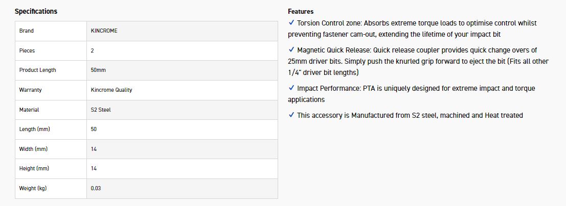 KINCROME K21499 BIT COUPLER Q/RELEASE 50MM 2PK