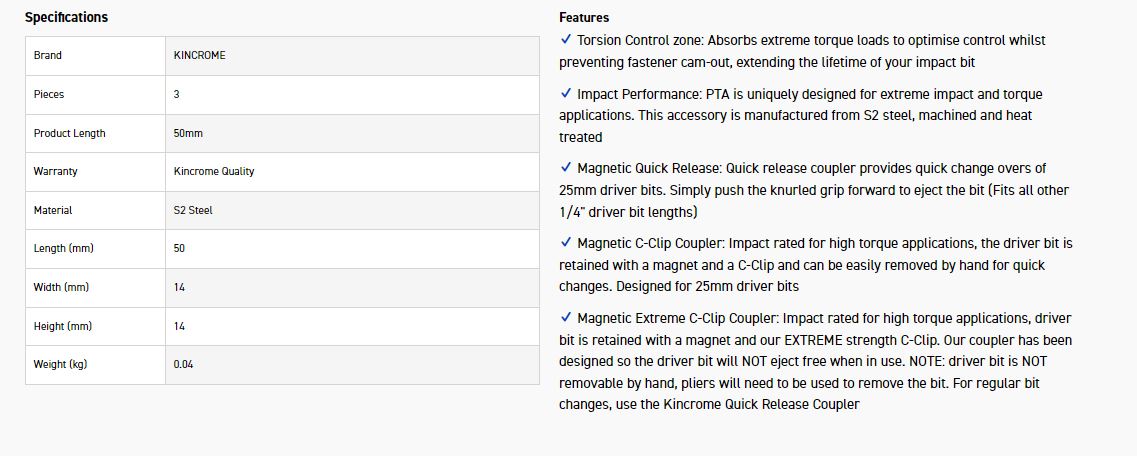 Magnetic Extreme C-Clip Coupler: Impact rated for high torque applications, driver bit is retained with a magnet and our EXTREME strength C-Clip. Our coupler has been designed so the driver bit will NOT eject free when in use. NOTE: driver bit is NOT removable by hand, pliers will need to be used to remove the bit. For regular bit changes, use the Kincrome Quick Release Coupler