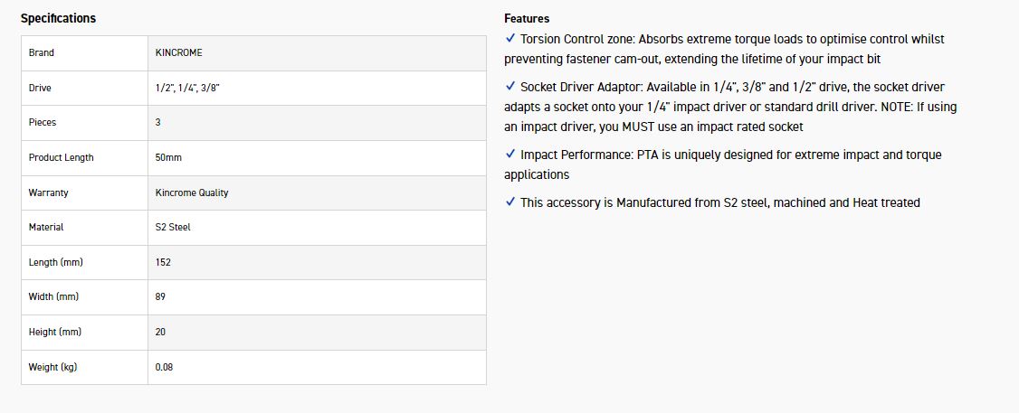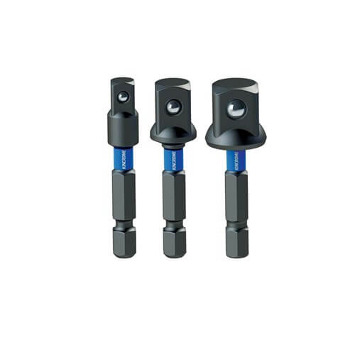 Socket Driver Adaptor: Available in 1/4″, 3/8″ and 1/2″ drive, the socket driver adapts a socket onto your 1/4″ impact driver or standard drill driver. NOTE: If using an impact driver, you MUST use an impact rated socket