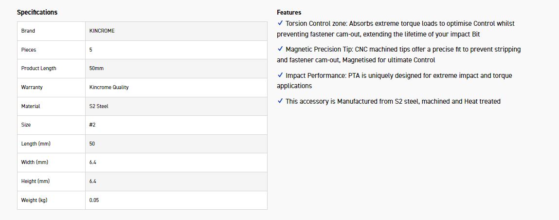 KINCROME K21518 IMPACT BIT PH#2_SQ#2 50MM 5 PK