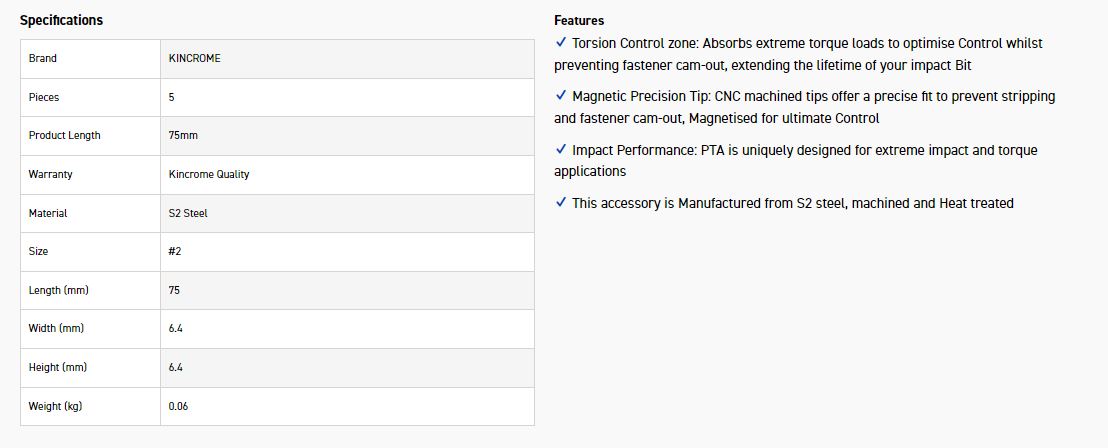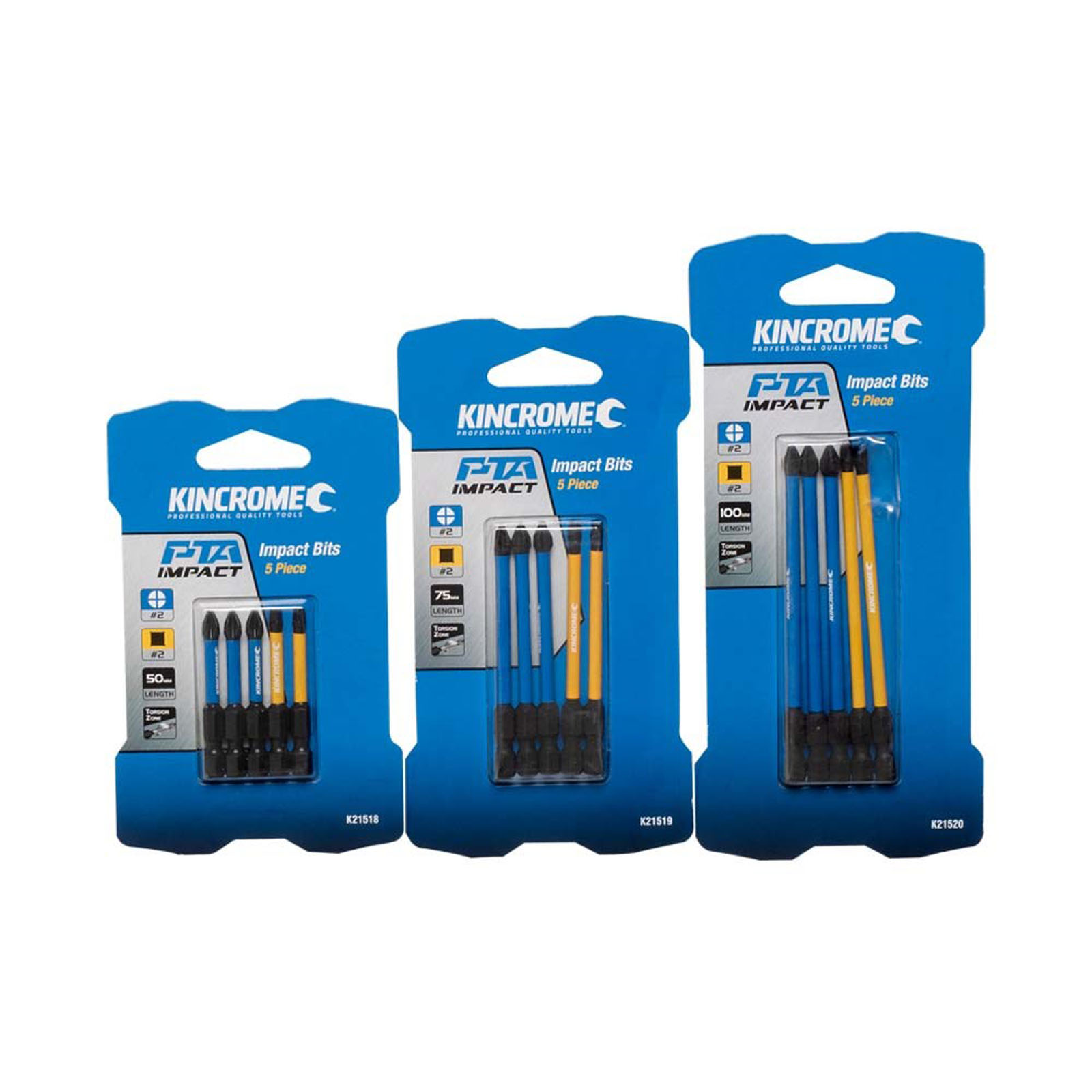 KINCROME K21519 IMPACT BIT PH#2_SQ#2 75MM 5 PK