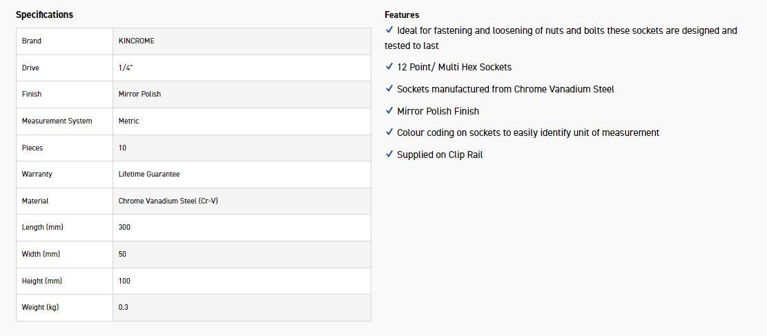 The Kincrome 10 piece Socket clip rail set offer professional quality sockets complete with a detachable rail to avoid losing your sockets in your toolkit. Ideal for fastening and loosening of nuts and bolts these sockets are designed and tested to last.