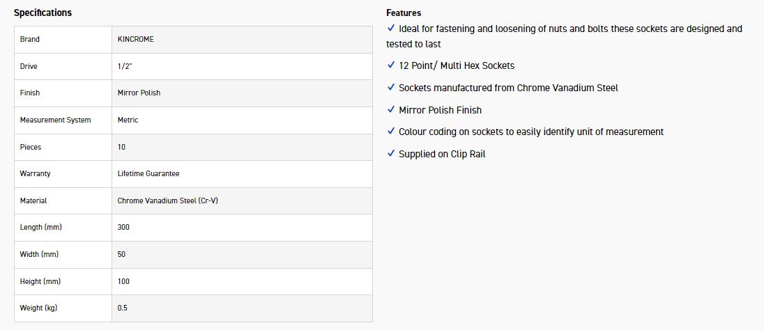 The Kincrome 10 piece Socket clip rail set offer professional quality sockets complete with a detachable rail to avoid losing your sockets in your toolkit. Ideal for fastening and loosening of nuts and bolts these sockets are designed and tested to last.