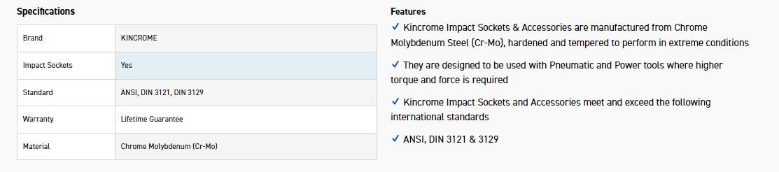 Kincrome Impact Sockets & Accessories are manufactured from Chrome Molybdenum Steel (Cr-Mo), hardened and tempered to perform in extreme conditions
