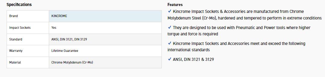 Kincrome Impact Sockets & Accessories are manufactured from Chrome Molybdenum Steel (Cr-Mo), hardened and tempered to perform in extreme conditions