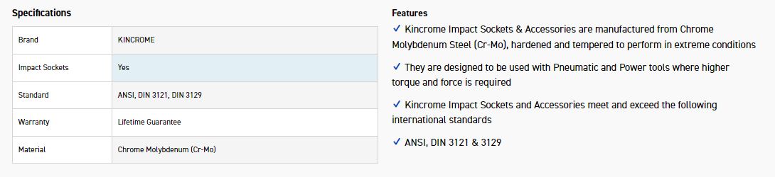 Kincrome Impact Sockets & Accessories are manufactured from Chrome Molybdenum Steel (Cr-Mo), hardened and tempered to perform in extreme conditions