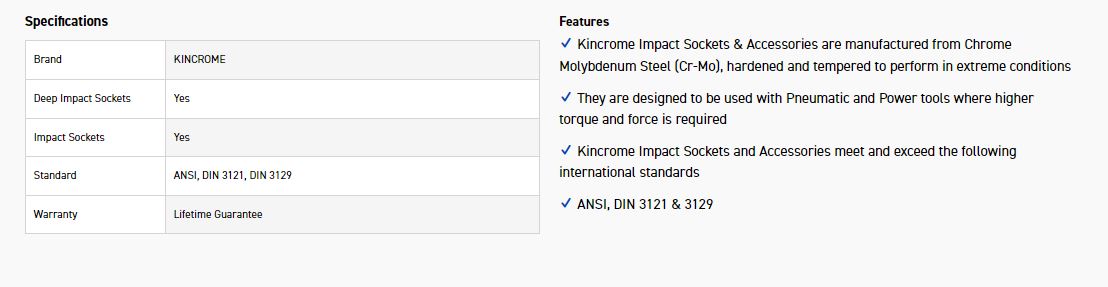 Kincrome Impact Sockets & Accessories are manufactured from Chrome Molybdenum Steel (Cr-Mo), hardened and tempered to perform in extreme conditions