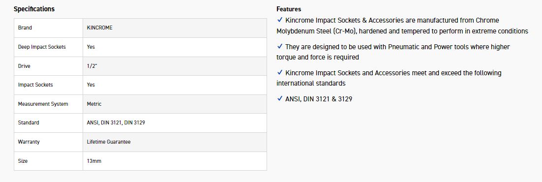 Kincrome Impact Sockets & Accessories are manufactured from Chrome Molybdenum Steel (Cr-Mo), hardened and tempered to perform in extreme conditions
