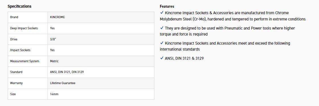 Kincrome Impact Sockets & Accessories are manufactured from Chrome Molybdenum Steel (Cr-Mo), hardened and tempered to perform in extreme conditions