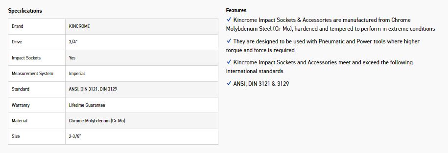 Kincrome Impact Sockets & Accessories are manufactured from Chrome Molybdenum Steel (Cr-Mo), hardened and tempered to perform in extreme conditions