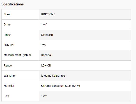 Kincrome LOK-ON™ Sockets, Sets and Accessories have been engineered beyond world-class benchmarks, exceeding all international torque and lifetime standards. Offering unique patented features such as the LOK-ON™ Socket’s ability to loosen up to 85% rounded/damaged fasteners, the LOK-ON™ range has been developed with both function and style in mind. Each component within the LOK-ON™ range includes features above and beyond the market’s expectation, setting a new benchmark for the professional quality tool industry.