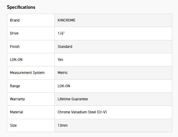 Kincrome LOK-ON™ Sockets, Sets and Accessories have been engineered beyond world-class benchmarks, exceeding all international torque and lifetime standards. Offering unique patented features such as the LOK-ON™ Socket’s ability to loosen up to 85% rounded/damaged fasteners, the LOK-ON™ range has been developed with both function and style in mind. Each component within the LOK-ON™ range includes features above and beyond the market’s expectation, setting a new benchmark for the professional quality tool industry.