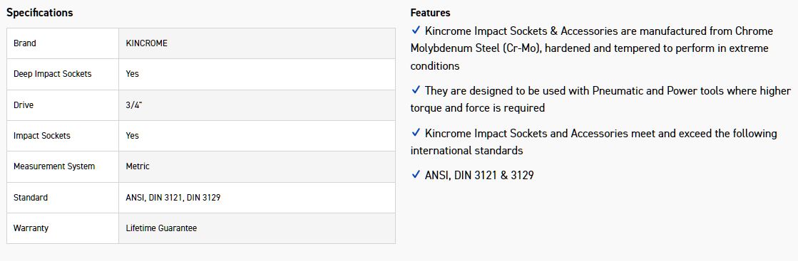 Kincrome Impact Sockets & Accessories are manufactured from Chrome Molybdenum Steel (Cr-Mo), hardened and tempered to perform in extreme conditions