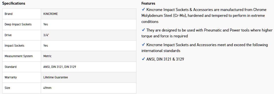 Kincrome Impact Sockets & Accessories are manufactured from Chrome Molybdenum Steel (Cr-Mo), hardened and tempered to perform in extreme conditions