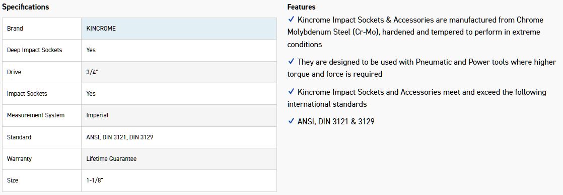 Kincrome Impact Sockets & Accessories are manufactured from Chrome Molybdenum Steel (Cr-Mo), hardened and tempered to perform in extreme conditions
