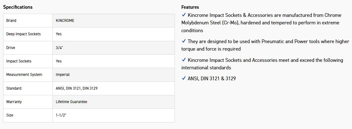 Kincrome Impact Sockets & Accessories are manufactured from Chrome Molybdenum Steel (Cr-Mo), hardened and tempered to perform in extreme conditions