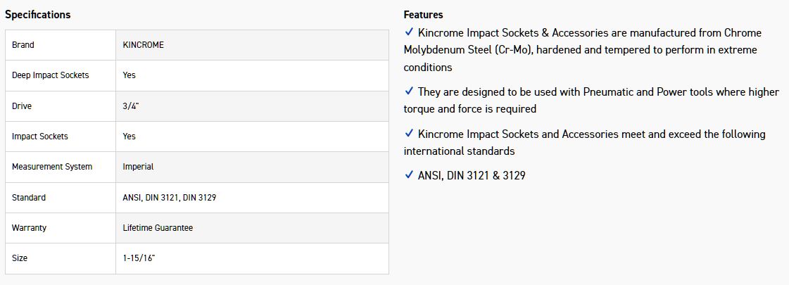 Kincrome Impact Sockets & Accessories are manufactured from Chrome Molybdenum Steel (Cr-Mo), hardened and tempered to perform in extreme conditions