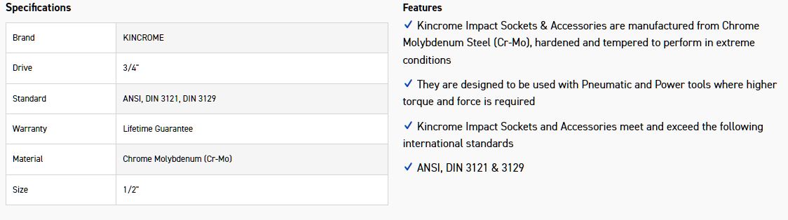 Kincrome Impact Sockets & Accessories are manufactured from Chrome Molybdenum Steel (Cr-Mo), hardened and tempered to perform in extreme conditions