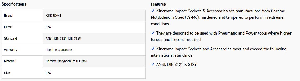 Kincrome Impact Sockets & Accessories are manufactured from Chrome Molybdenum Steel (Cr-Mo), hardened and tempered to perform in extreme conditions