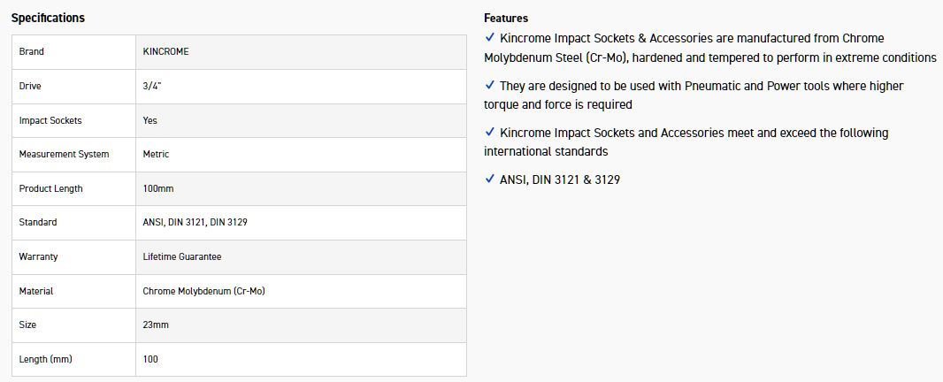 Kincrome Impact Sockets & Accessories are manufactured from Chrome Molybdenum Steel (Cr-Mo), hardened and tempered to perform in extreme conditions
