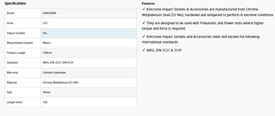 Kincrome Impact Sockets & Accessories are manufactured from Chrome Molybdenum Steel (Cr-Mo), hardened and tempered to perform in extreme conditions