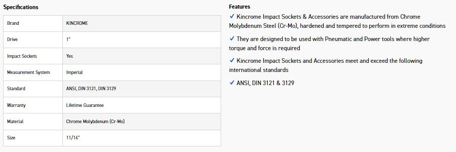 Kincrome Impact Sockets & Accessories are manufactured from Chrome Molybdenum Steel (Cr-Mo), hardened and tempered to perform in extreme conditions