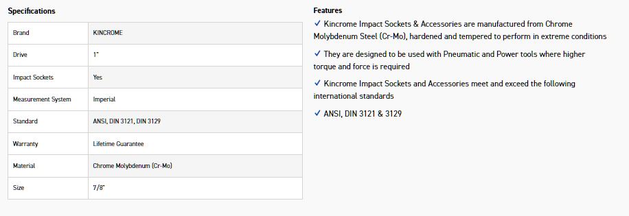 Kincrome Impact Sockets & Accessories are manufactured from Chrome Molybdenum Steel (Cr-Mo), hardened and tempered to perform in extreme conditions