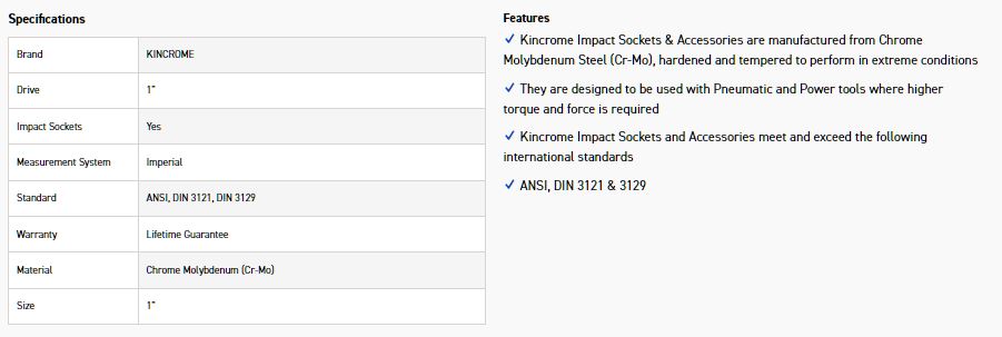 Kincrome Impact Sockets & Accessories are manufactured from Chrome Molybdenum Steel (Cr-Mo), hardened and tempered to perform in extreme conditions