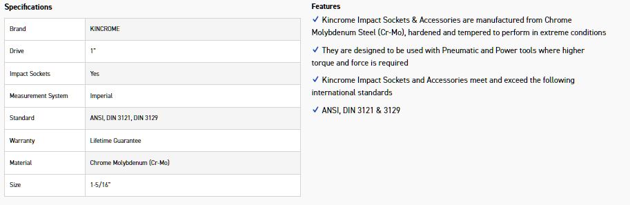 Kincrome Impact Sockets & Accessories are manufactured from Chrome Molybdenum Steel (Cr-Mo), hardened and tempered to perform in extreme conditions