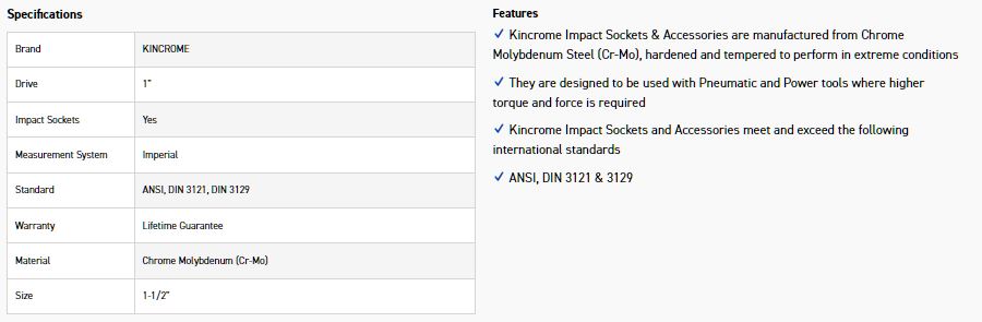 Kincrome Impact Sockets & Accessories are manufactured from Chrome Molybdenum Steel (Cr-Mo), hardened and tempered to perform in extreme conditions