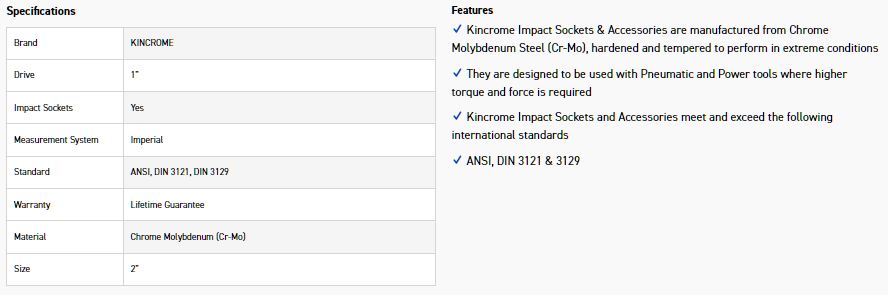 Kincrome Impact Sockets & Accessories are manufactured from Chrome Molybdenum Steel (Cr-Mo), hardened and tempered to perform in extreme conditions