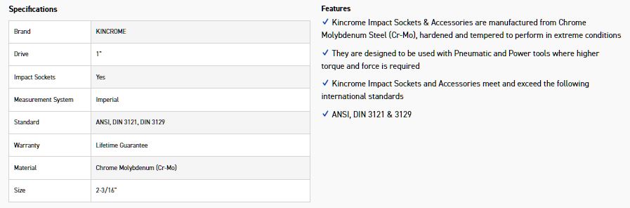 Kincrome Impact Sockets & Accessories are manufactured from Chrome Molybdenum Steel (Cr-Mo), hardened and tempered to perform in extreme conditions