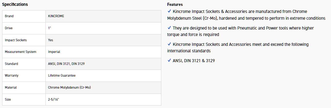 Kincrome Impact Sockets & Accessories are manufactured from Chrome Molybdenum Steel (Cr-Mo), hardened and tempered to perform in extreme conditions