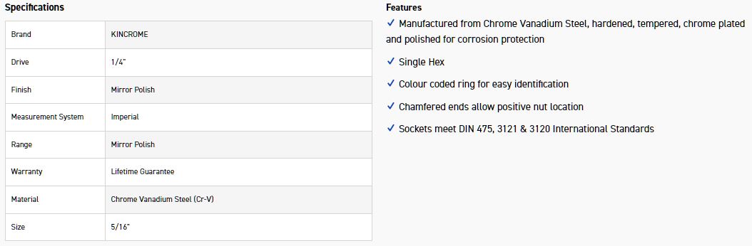 KINCROME K26535 SOCKET DEEP 1/4DR 5/16 (MP)